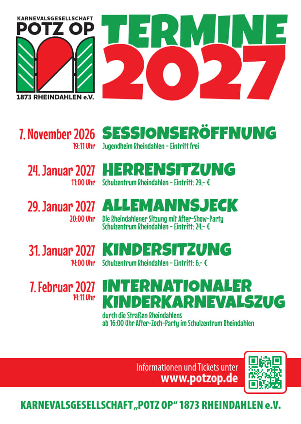 Aktuelle News: Termine 2027 Kinderkarnevalszug 2026 Kölsche Messe 2026 Jubiläumssession 2022/2023 150 Jahre Potz op Rheindahlen 1873 e.V.