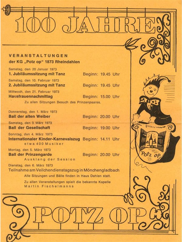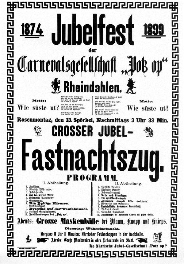 Im Jahr 1899 verkündete ein Plakat in der Größe 70 x 100 – es ist in dieser Broschüre noch einmal wiedergegeben – das 25jährige Jubiläum der „Potz op“ mit einem Riesenprogramm, das man in der heutigen Zeit nicht mehr zu überbieten vermag. Die Schmunzelnde Bemerkung des Chronisten, daß man dem Hundertjährigen wohl 1 Prozent Schwund (= 1 Jahr) zugerechnet hätte, korrigierte das Präsidium sehr treffend, daß die Gründung der Gesellschaft nur vor der Session 1874, also am 11.11.1872 erfolgt sei.