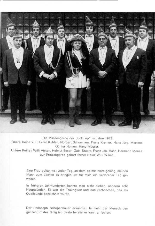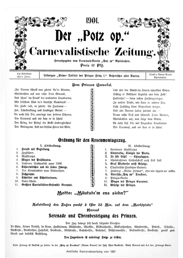Was soll´s also – es stimmt. Es stimmt auch, daß der Verein noch bevor in Rheindahlen eine eigene Zeitung gedruckt wurde, die 2-2mal in der Woche erschien, in der „Potz op“-Druckerei Anton Reuter eine Carnevalistische Zeitung „Der Potz op“ aufgelegt hat. Es war, wie aus dem Abdruck von 1901 in dieser Broschüre zu ersehen, das Leiborgan „Seiner Tollität des Prinzen Heinz I“, Beherrscher aller Narren. Preis 10 Pf. 1956 verstarb Anton Reuter, der lange Jahre mit seinen Freunden Peter Brendgens, Karl Zeutzius, Peter Neusen und Fritz Gülkers das Leben und Treiben in Rheindahlen mit bestaunenswerter Findigkeit beobachtete und „karnevalsreif“ frisierte, im Alter von 81 Jahren. Die Gesellschaft durchlebte ihre große Zeit vor dem ersten Weltkrieg. Die Karnevalszüge in Rheindahlen und die vielen Veranstaltungen in den damals sehr zahlreich vorhandenen Lokalitäten brachten großen Zulauf auch aus dem Hinterland, so daß man in der Tat bald von einem Volkskarneval in Dahle sprach. So manche Lebensweisheit fand man bei der „Potz op“, wie „Wenn eine Frau auch noch so neugierig ist, sie fragt nie, woher der Mann das Geld nimmt, welches sie braucht“, und „Mancher würde seine Frau gleich in den Himmel heben, wenn er wüßte, daß sie nicht mehr herunter käme“: Rektor Krautwurst, seines Zeichens mit ausgeprägter karnevalistisch-musikalischer Ader versehen, schenkte in dieser Zeit der „Potz op“ den heute noch gesungenen Reim.