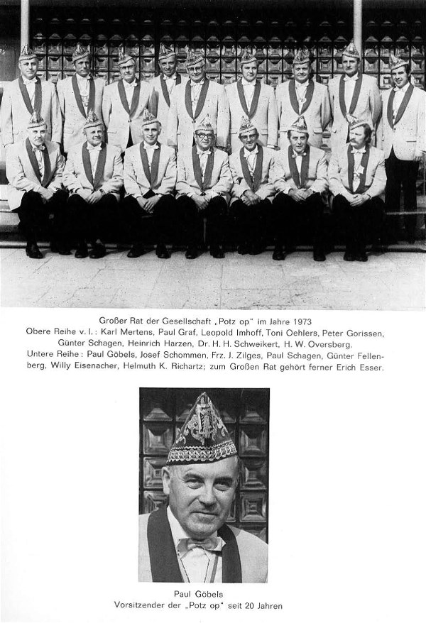 Um diese Zeit „nistete“ auch die Potz op “ In einer wohligen Brutstätte im Dahler Land und das Nesthäkchen sollte dann – wer hätte es damals geglaubt – hundert Jahre alt werden. Karnevalisten sind nicht anachronistisch, was mit dem offenen Tor der Freude, das allen Zugang bietet, bewiesen werden soll. Sie erklärten sich auch frei von Ambitionen, denn diese hätte ihrer Stellung sicher in der damaligen Zeit nur abtrünnig sein können. So hörten sie stets auf die Stimme des Volkes – waren also wahre Demokraten – und formten ihren und des Bürgers Karneval nach örtlichen eigenständigen Gegebenheiten. Das sollte sich bald auszahlen in ein einem Volkskarneval in Rheindahlen, wie er zwischen Köln und Rheindahlen nicht seinesgleichen hatte. Wenn Gesellschaften und Klubs am Rhein manchmal Ihre Feste neben Unterstützung namhafter Unternehmen mit Hilfe einer Carnevalstotterie finanziell unter Dach brachten, so hielt man in Dahlen die Kosten in überschaubaren Grenzen. Vielleicht war das mit ein Grund für die Beständigkeit – was auch heute noch zur Nachahmung anzuraten ist.