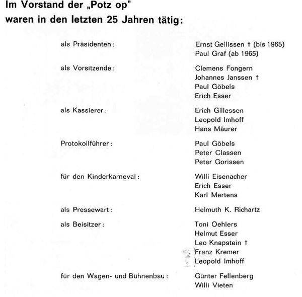 Die Gesellschaft schloß sich im Jahre 1952 dem Festausschuß Mönchengladbacher Karneval an. Sie verzichtete damit auf die Durchführung eigener Karnevalsumzüge, die ohnehin heute in dem seit 51 Jahren polotisch eingemeindeten Stadtteil Rheindahlen an Bedeutung verloren hätten. Dafür beteiligte sie sich jeweils am Veilchendienstagszug und pflegt die Geselligkeit mit anderen städtischen Gesellschaften. „Potz op“ bemüht sich heute, beste Karnevalssitzungen und Veranstaltungen zu bieten, um so dem an sich hochgestellten Niveau eines anspruchsvollen Publikums gerecht zu werden. Vorstand und Präsident wollen das Freudentor weiter öffnen und haben mit dem seit 5 Jahren groß angelegten Kinderkarnevalszug am Fastnachtssonntag einen neuen Akzent in die tollen Tage hineingebracht. Alljährlich findet eine Nikolausfeier statt. Die Bevölkerung anerkennt und fördert dankenswert diese Bestrebungen.